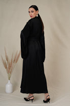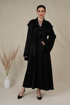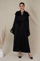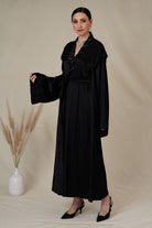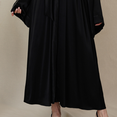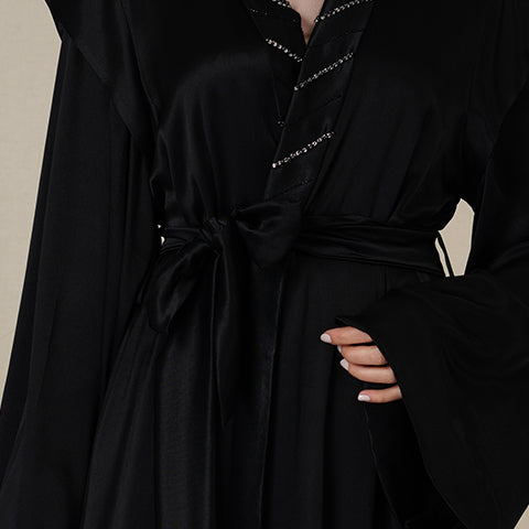 Black opal a silk abaya—a blend of glamour and comfort with a front-open design, intricate bead embellishments, and a belt for ethnic charm. Gracefully flared