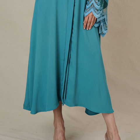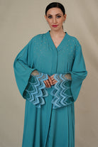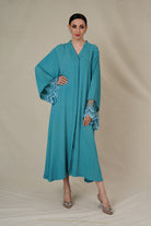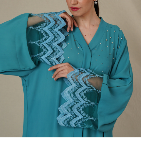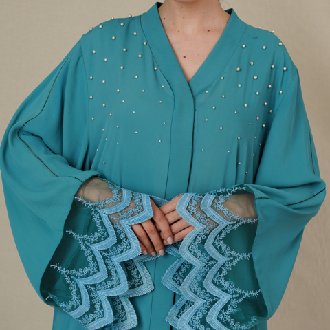 Fragile beauty – an abaya that seamlessly blends front open with concealed snap buttons sophistication and comfort. White pearls enhance its grace. Crafted from luxuriously smooth mat finish satin fabric, draped in elegance, it showcases finely stitched straight