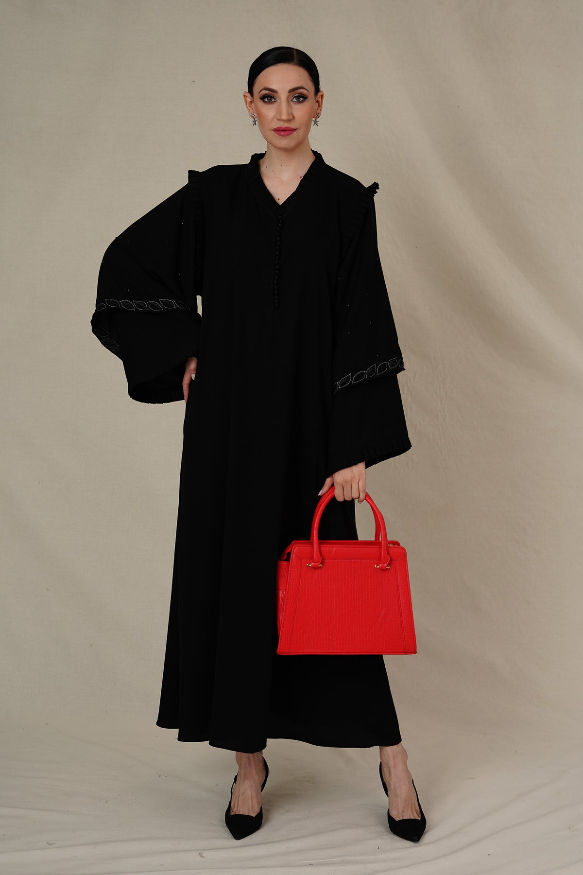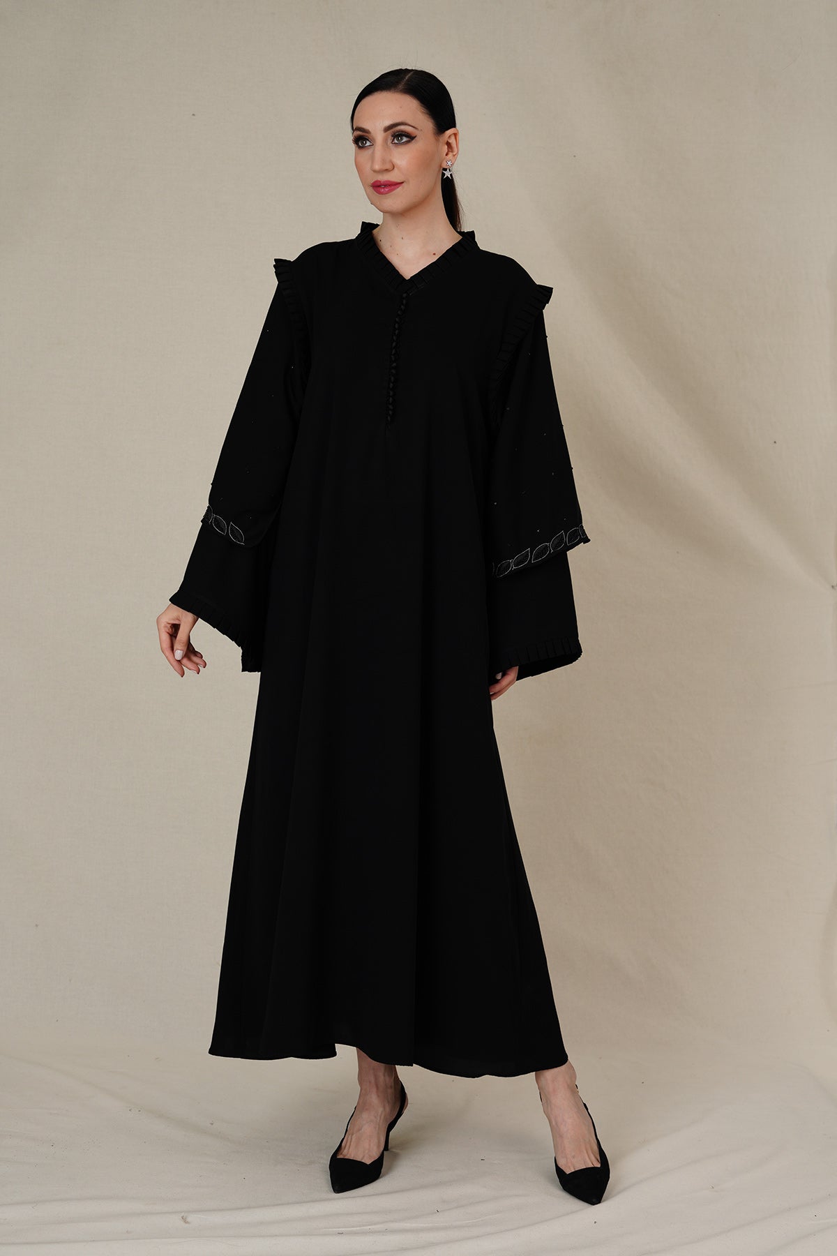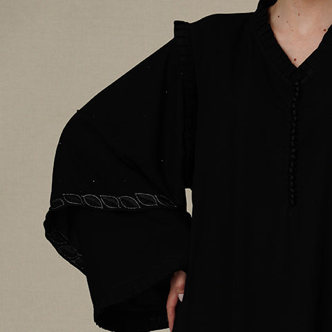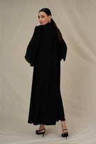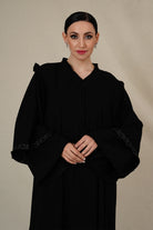 your fashion with our exquisite women's abaya—an epitome of creativity and comfort that seamlessly combines style with ease.Crafted from the highest quality fabric, it promises luxurious feel and chic design. Adorned neckline with elegant buttons and hand embellished double-layered sleeves finished with delicate frills add grace.