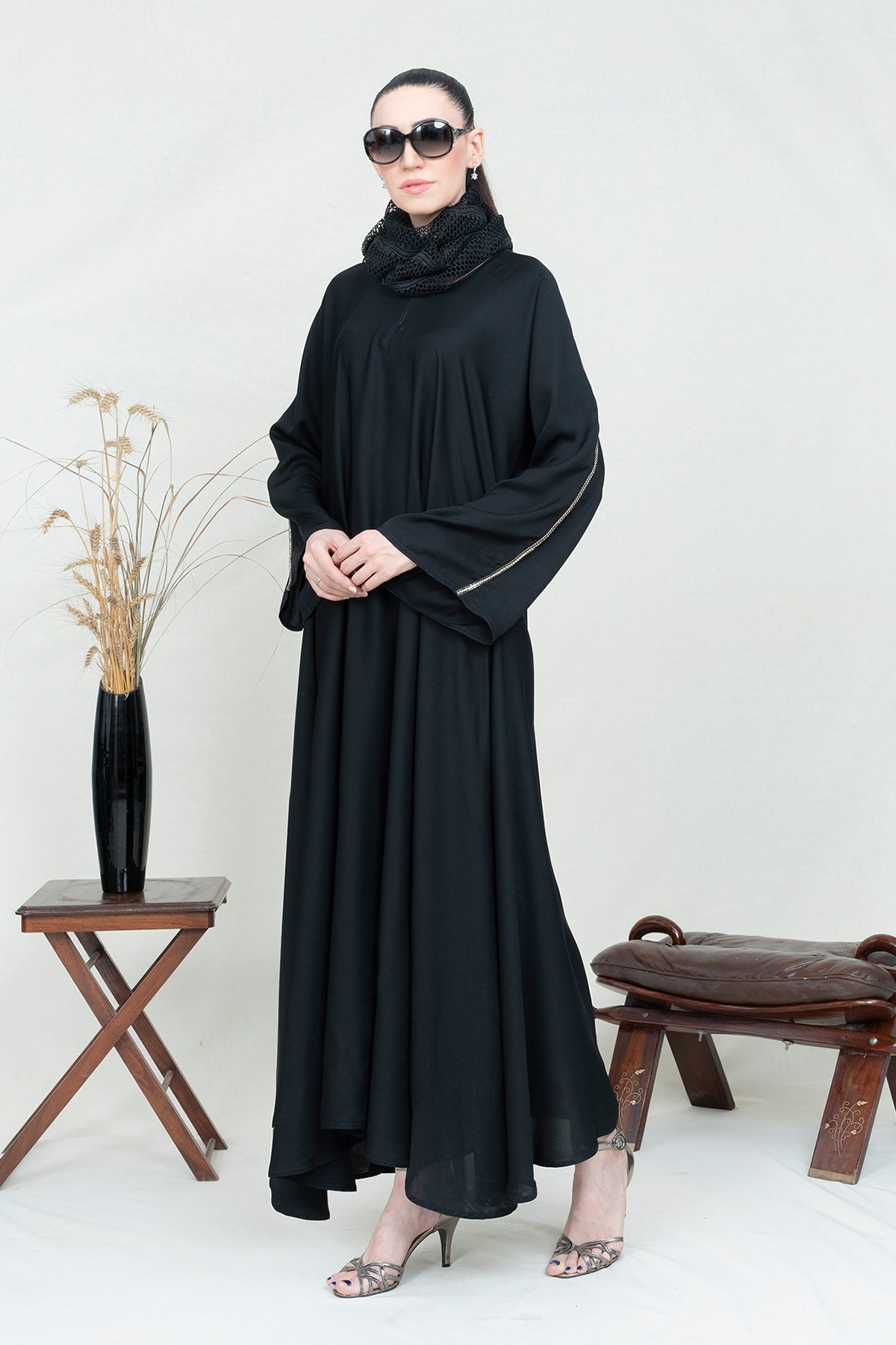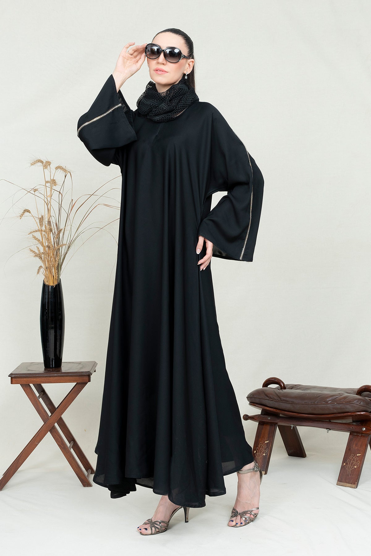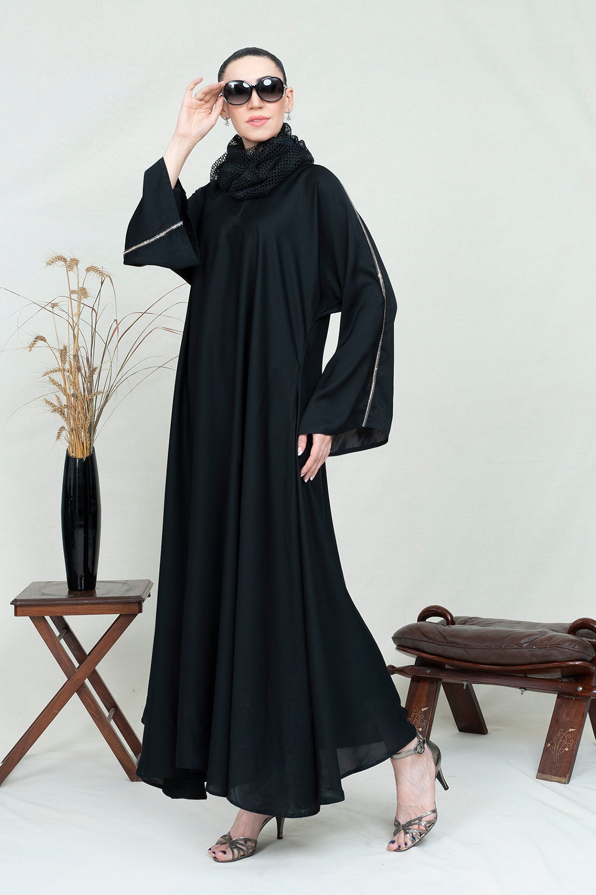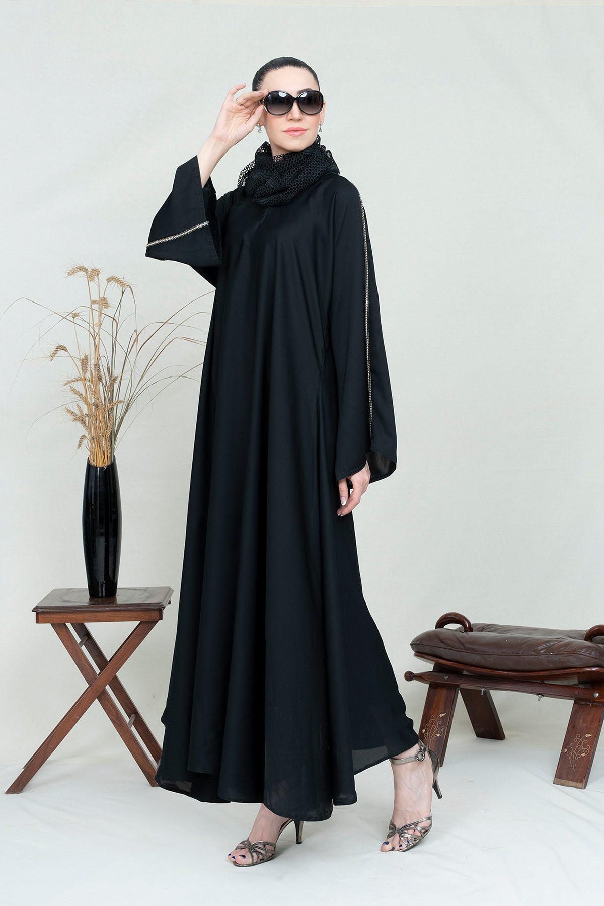 Moon Stone abaya. long-bell sleeved decorated with black and silver stone.lace. Crafted with precision, with big flayer.