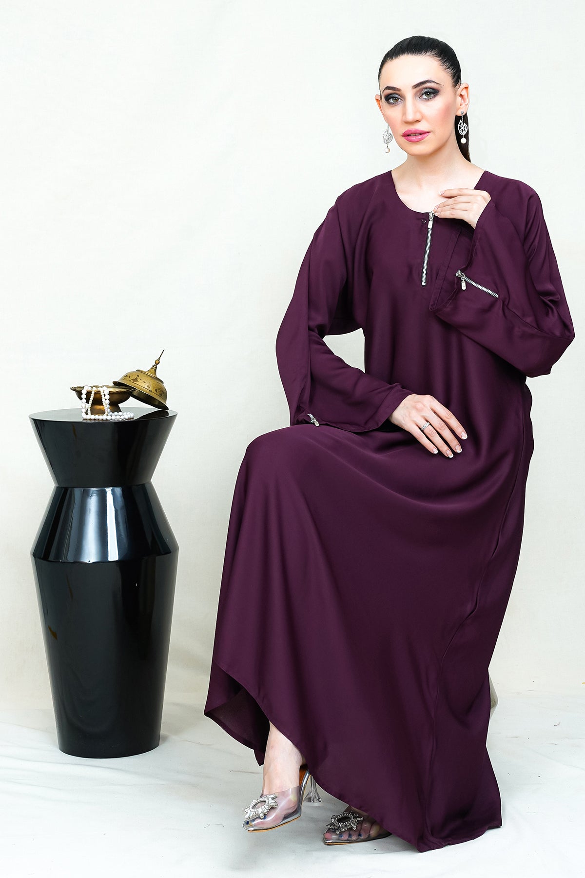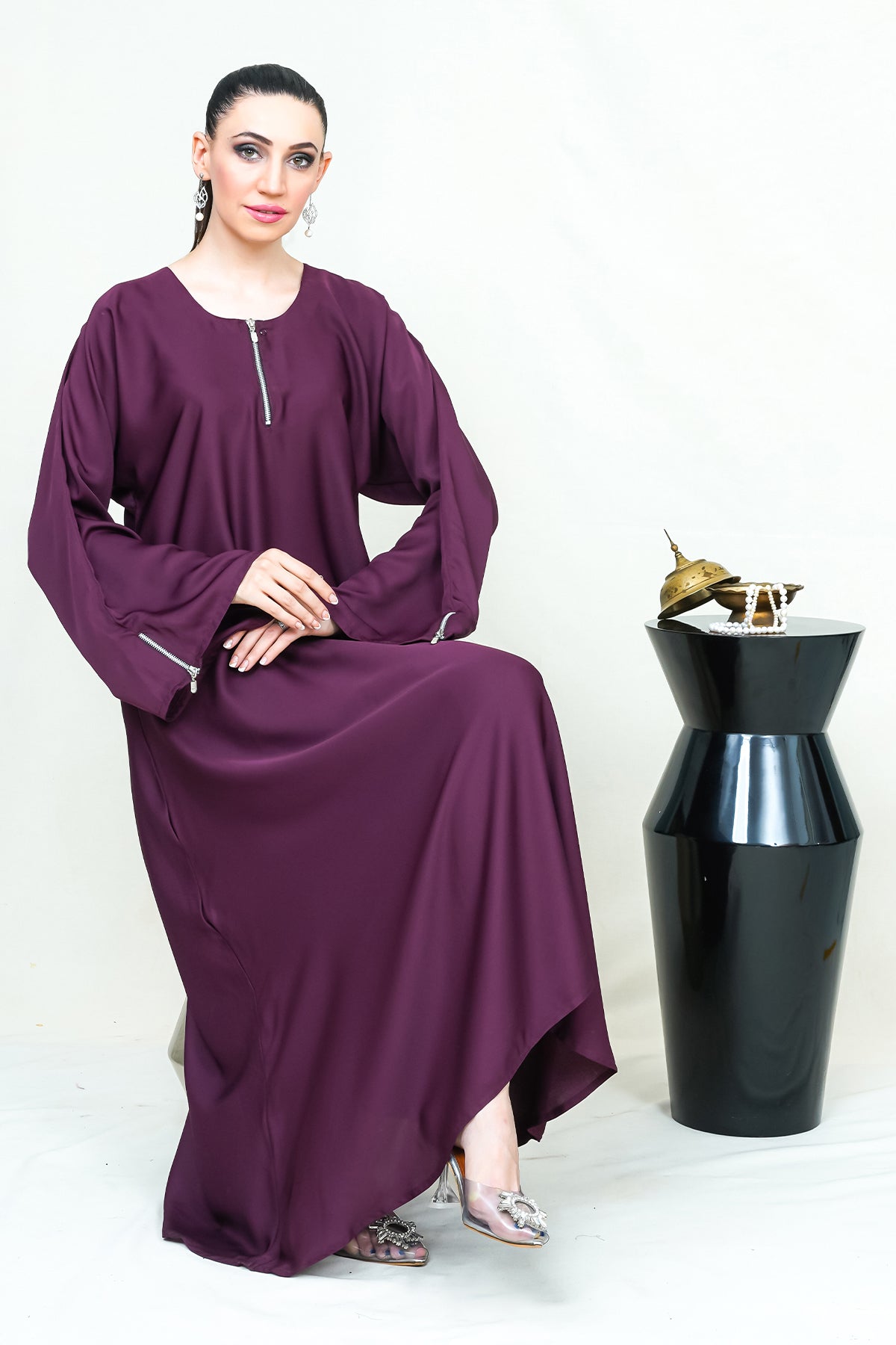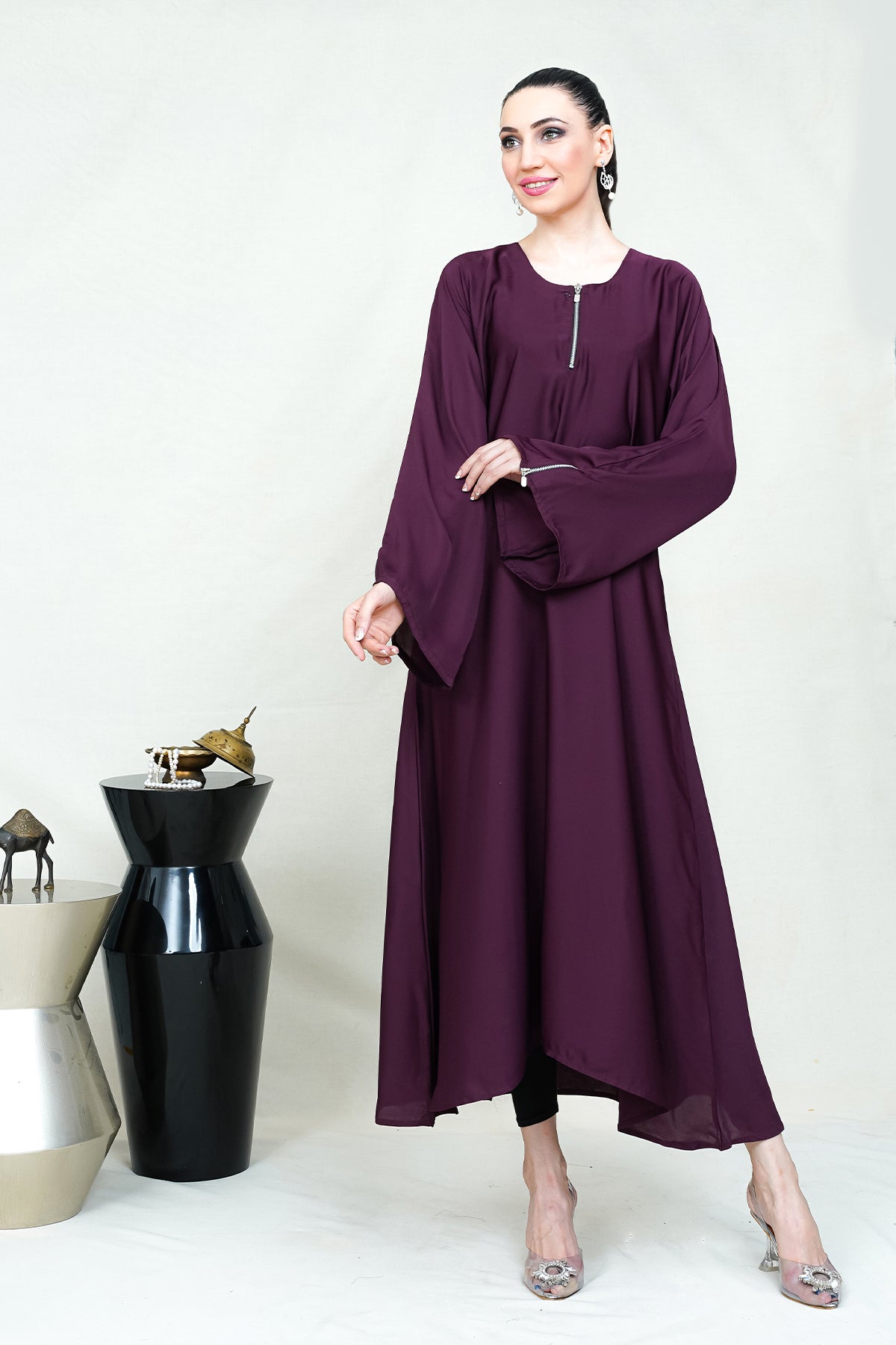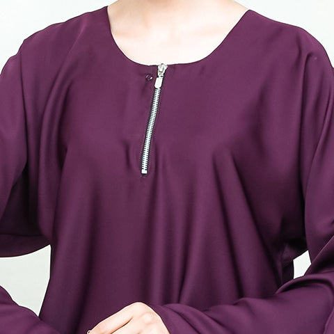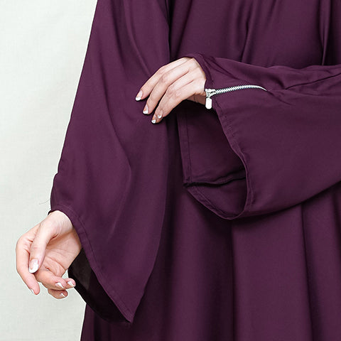 Plum Abay with metal zipper on neckline and on bell sleeves. Whether you're attending a special occasion or stepping into a professional working environment, this elegant abaya is the perfect choice. Its refined design and fine satin construction make it suitable for a range of events, exuding grace and sophistication at every turn.