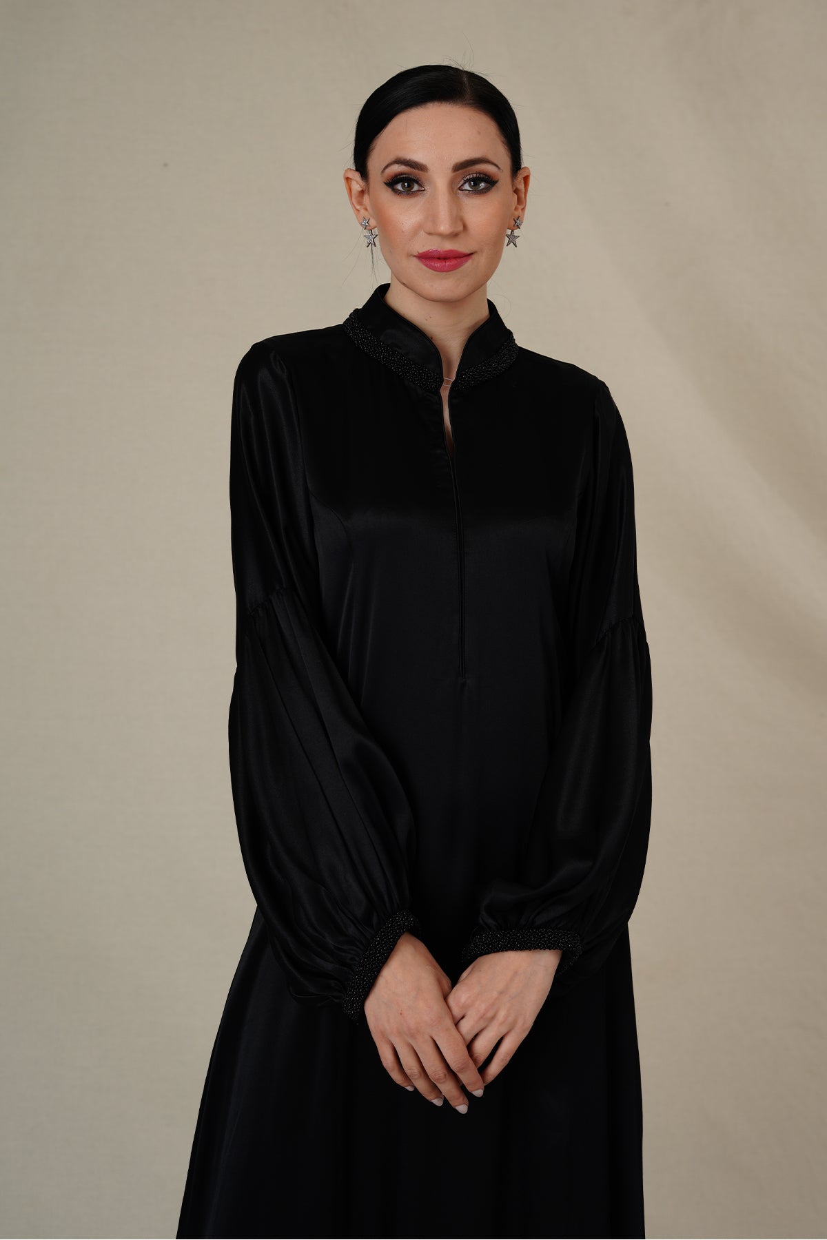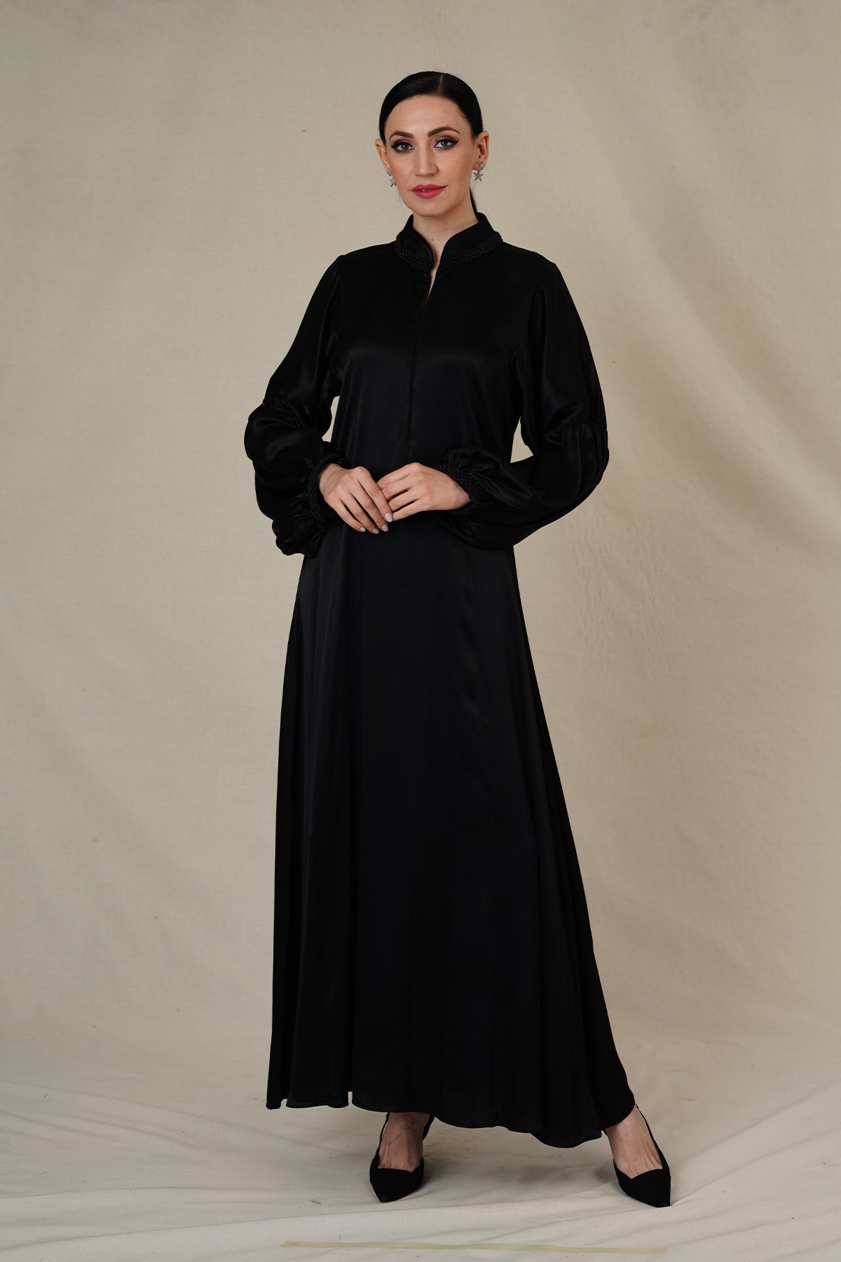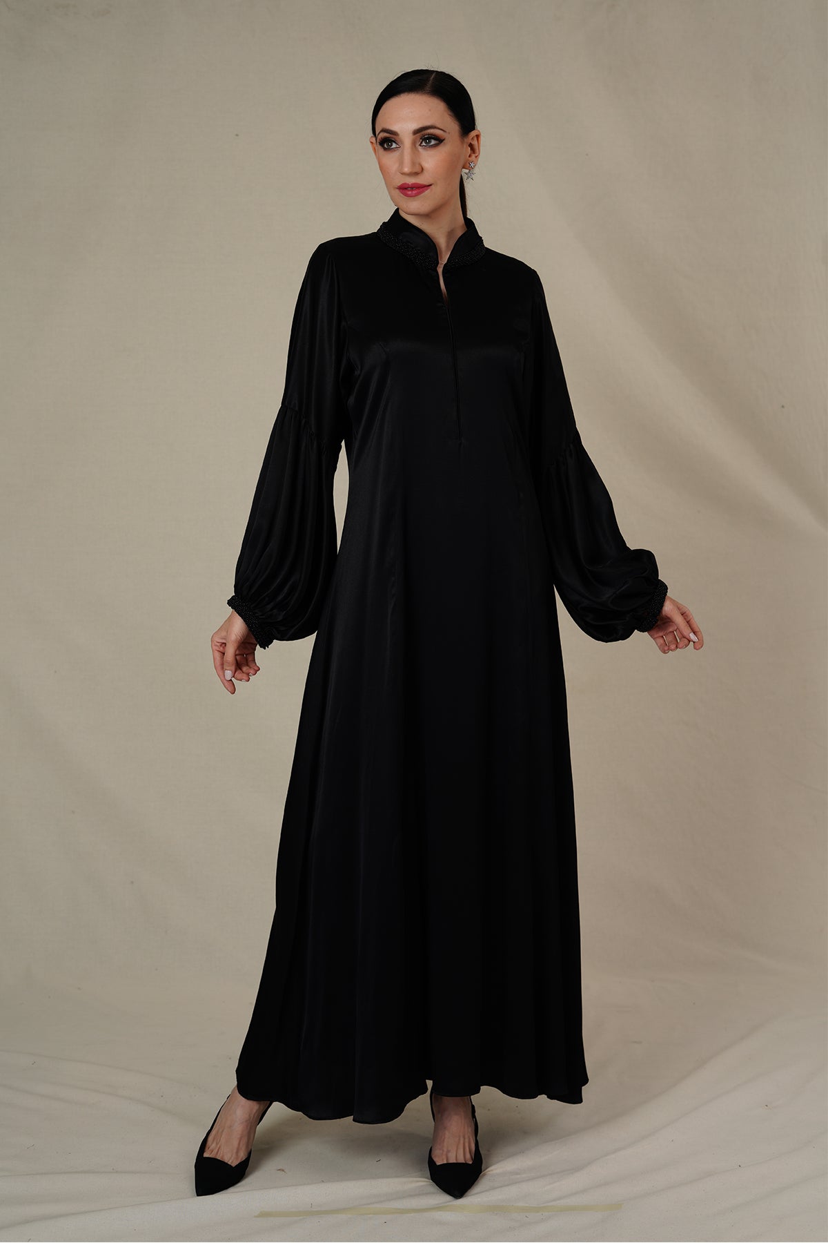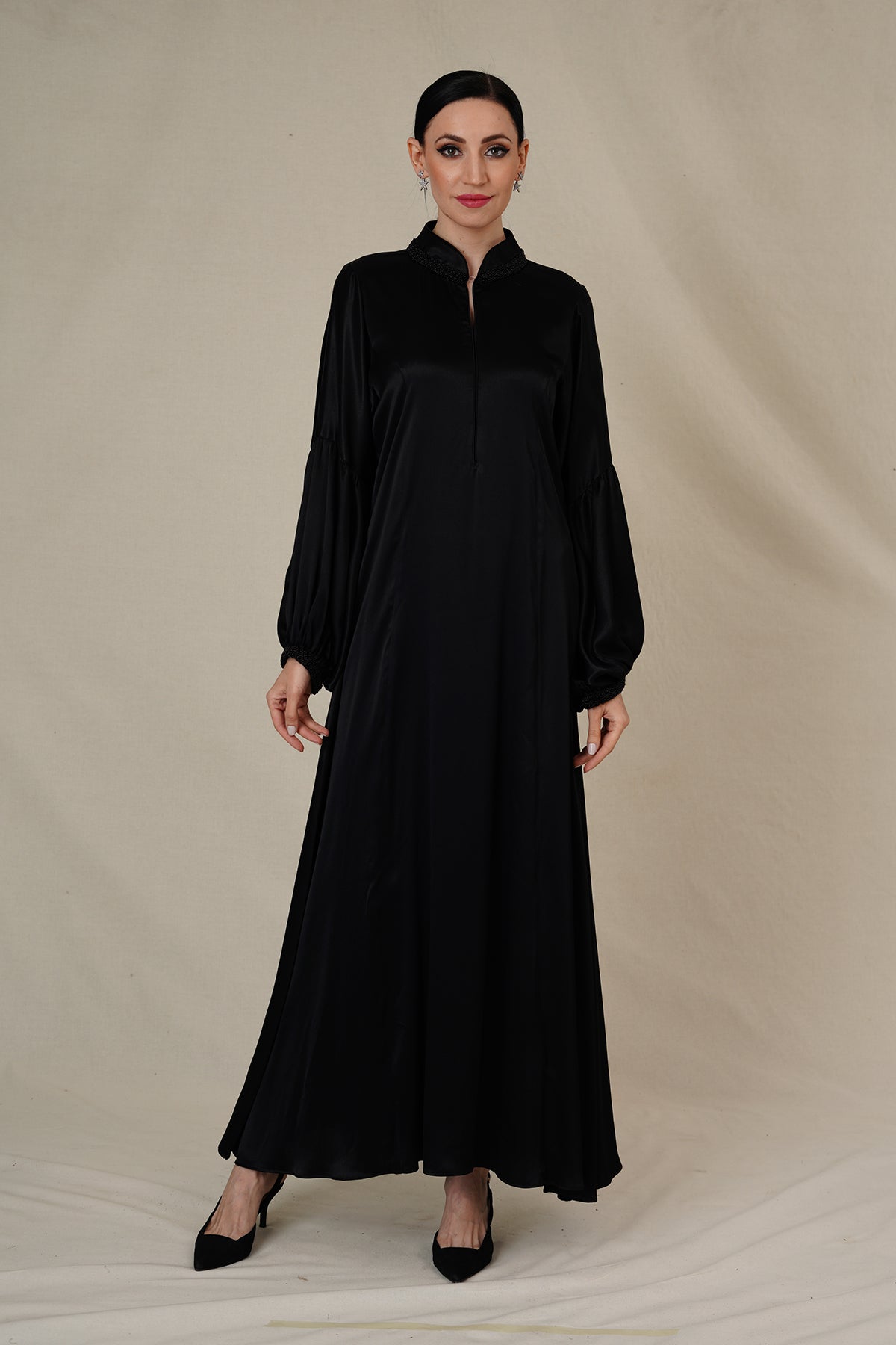 style is evident in its flowing silhouette adorned with beads lace on neckline and ruffled cuffs., allowing you to move with ease while exuding confidence.