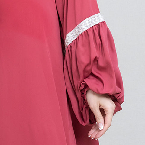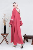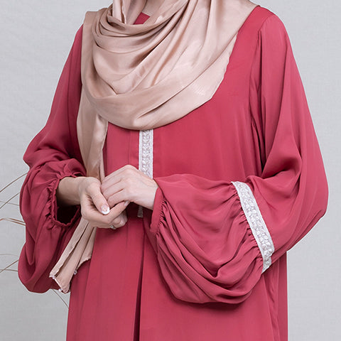 Royal Rose Abaya, crafted from luxuriously smooth mat finished satin fabric. Exquisite ruffles on the sleeves complemented by intricate