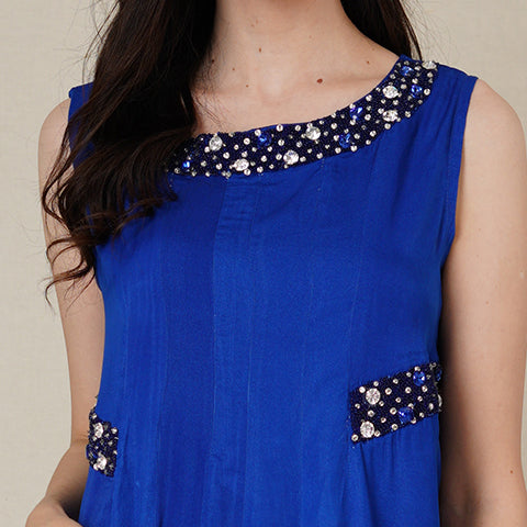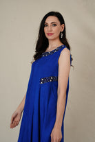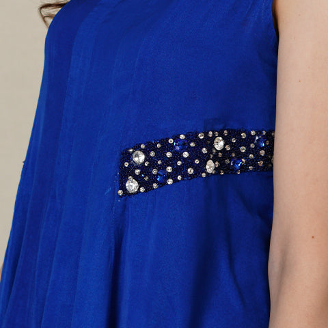 Experience celestial elegance with our silk paneled Dress.Crafted from premium silk fabric. The boat neckline and sleeveless design