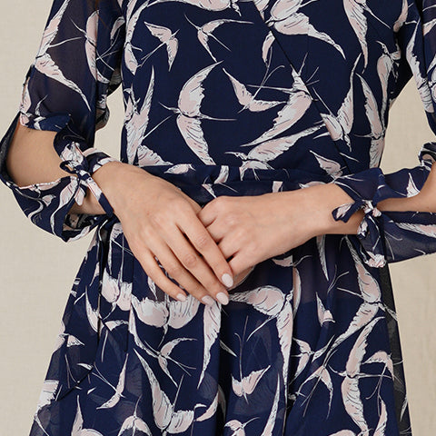 the waist belt creates a flattering silhouette with a subtle flare, exuding grace. Hanging sleeves add charm, elevating the dress to a new level of chic and timeless style.