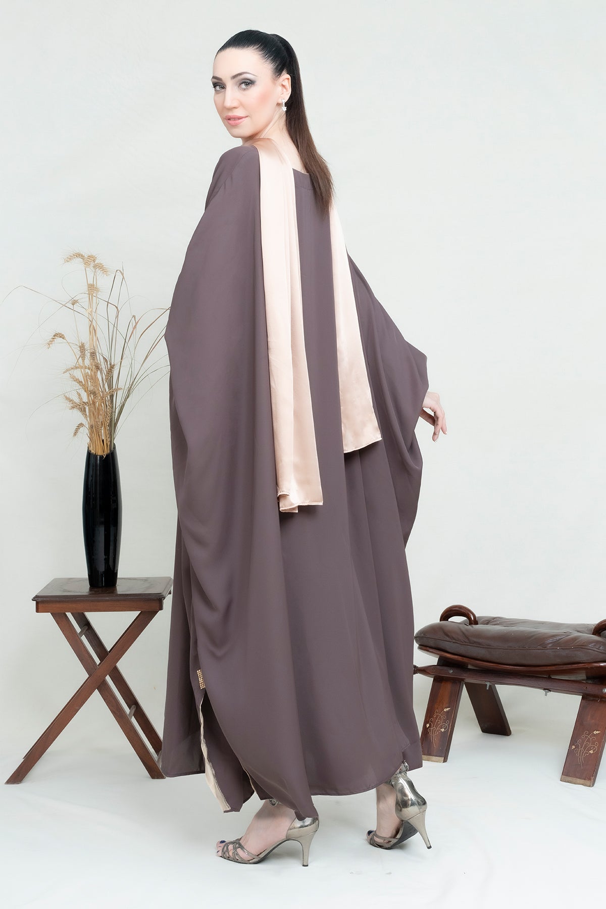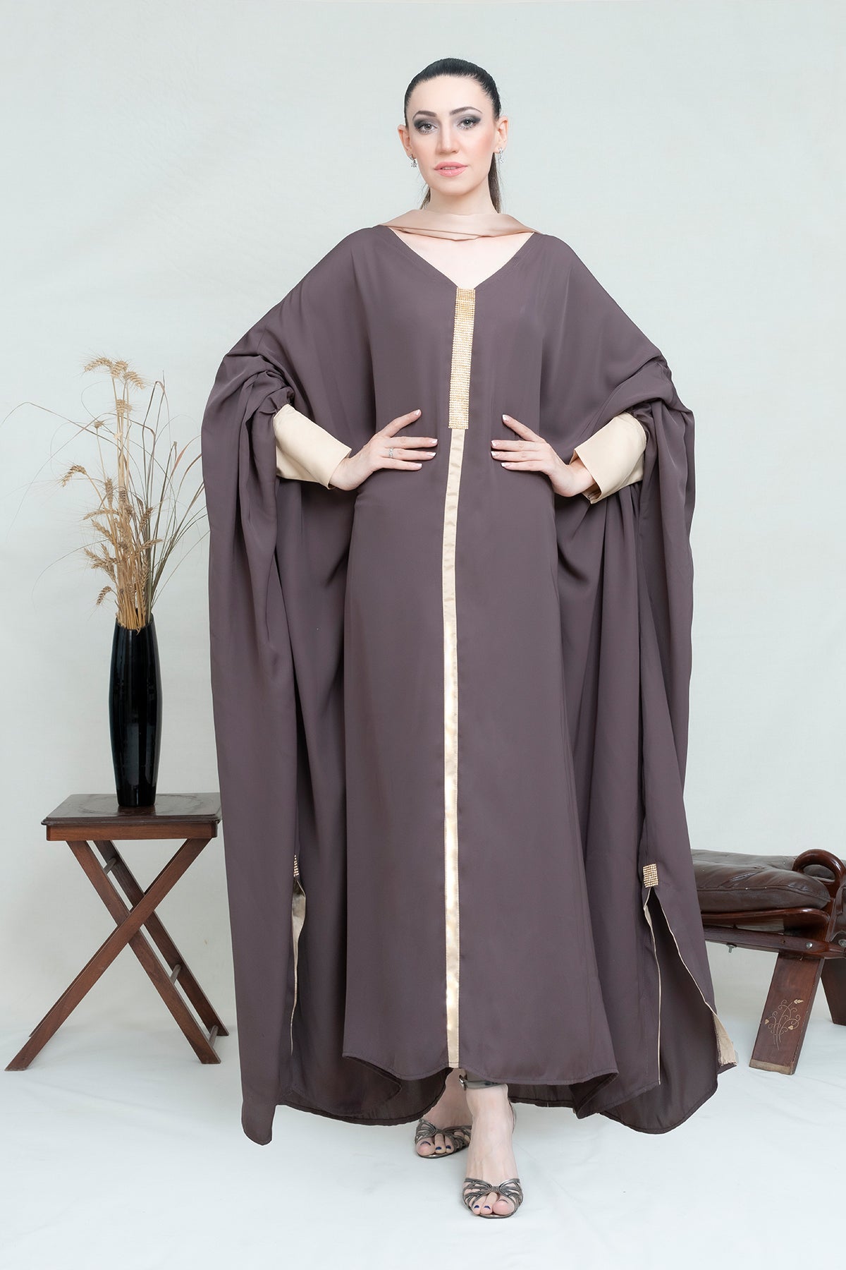 Butterfly wing abaya is meticulously crafted from satin fabric, this Kaftan abaya ensures a graceful drape and comfortable wear. Attention to detail is with cuffed sleeves evident in the ornate golden stone mesh adorning the front and sides, adding opulence and enhancing its overall beauty.