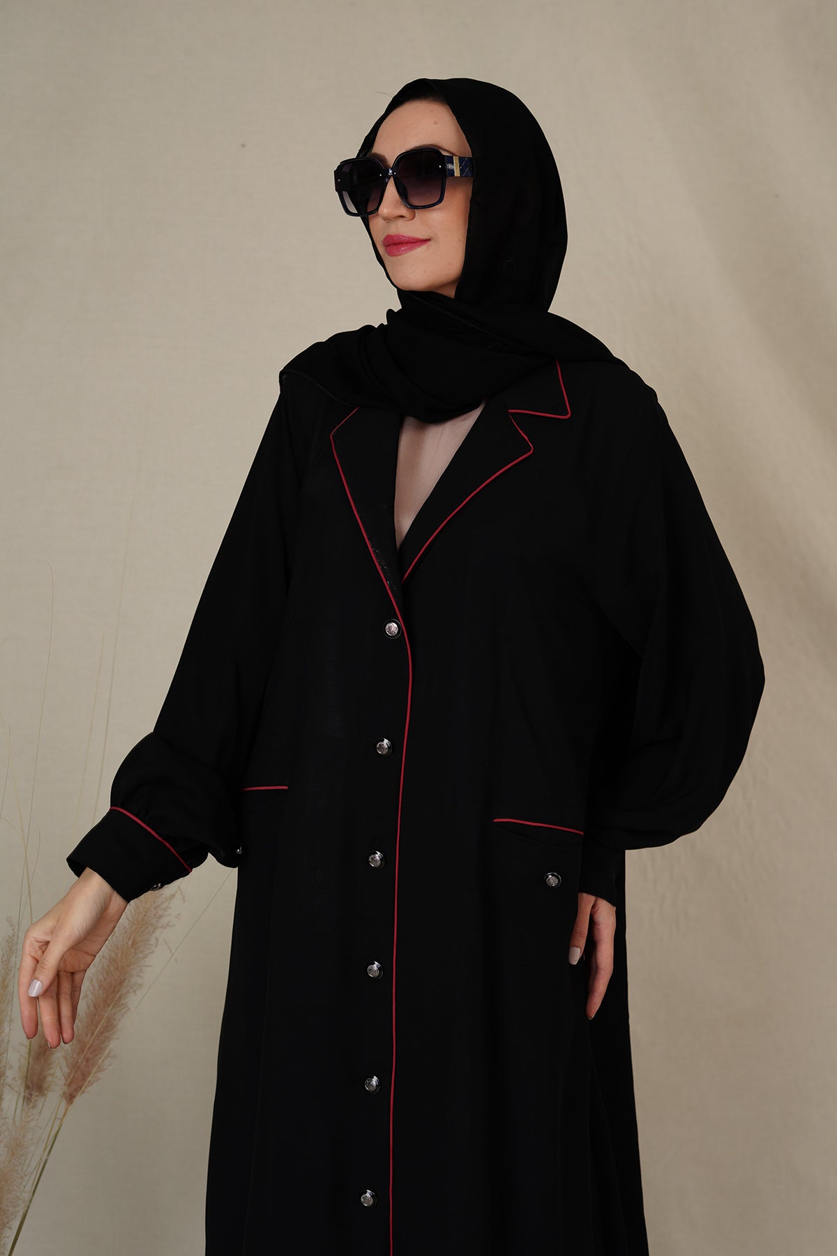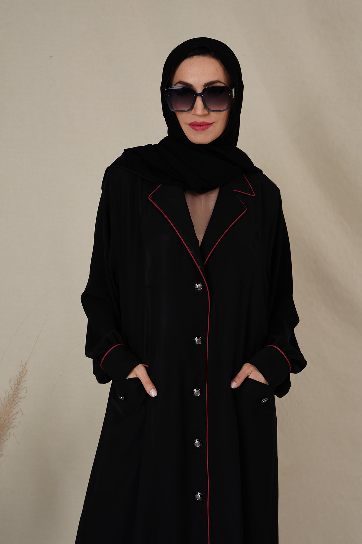 Luxuriant abaya – a captivating piece designed for a bold and timeless fashion statement. Meticulously crafted from the highest quality georgette fabric, The V-neck collar, adorned with beautiful buttons, offers versatility, while cuffed sleeves, front pockets, and a red lining add sophistication and functionality.Perfect for the stylish working woman, Embrace the fusion of style and grace