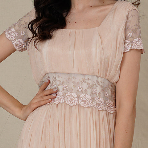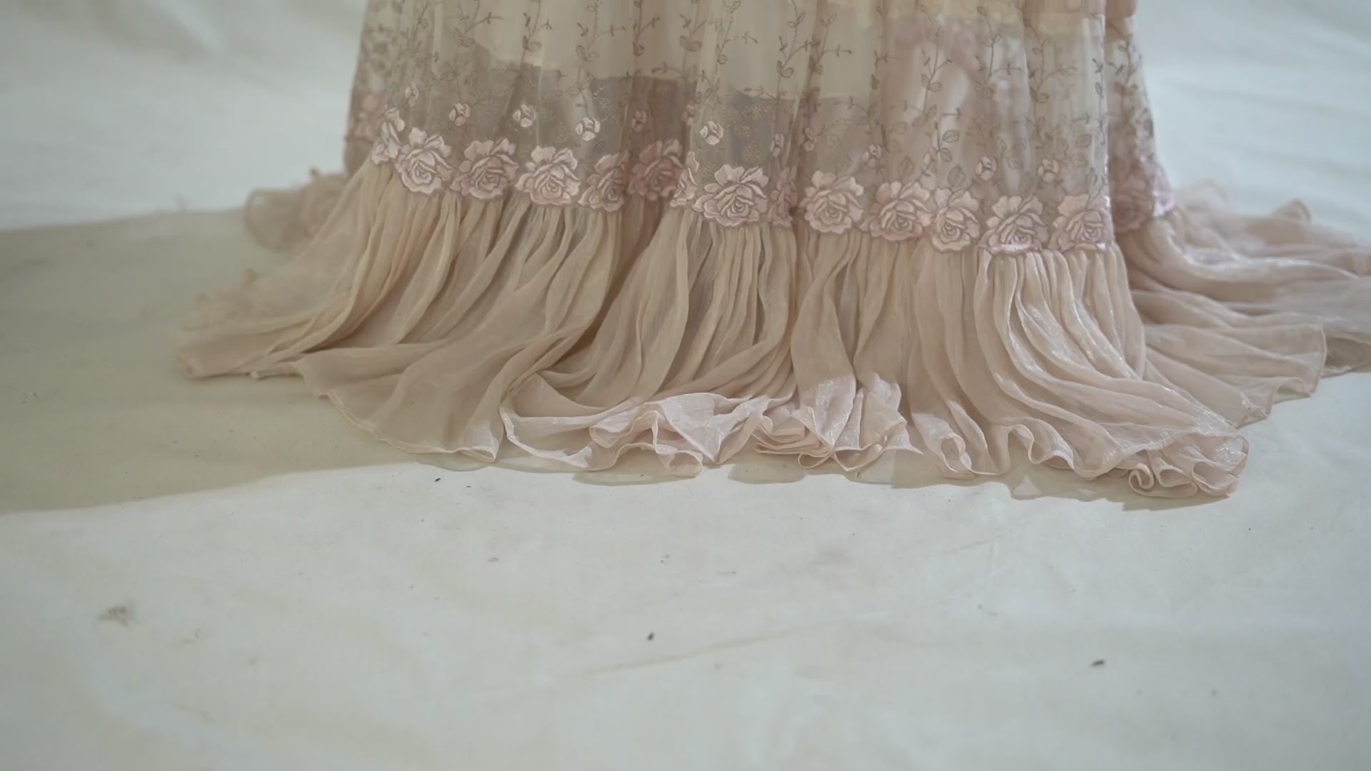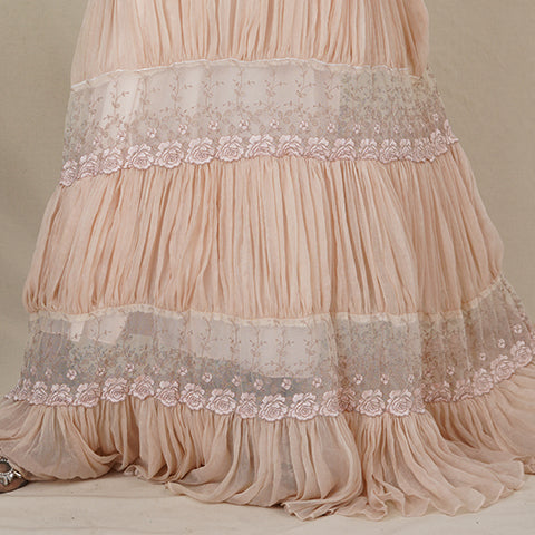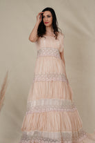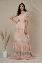 Introducing, a testament to elegance gown. Crafted with the utmost care from the finest chiffon and net lace, this exquisite gown features lace sleeves for added allure. The square neckline and delicate net lace pleats create a harmonious blend of charm,