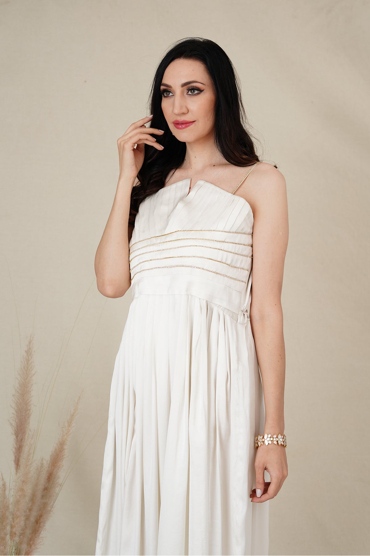 graceful V-neckline, delicate pleated detailing, creating a refined ensemble. The pleated bodice features intricate metal lace. harmoniously blending classic charm with contemporary allure.